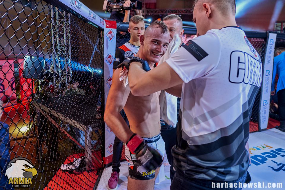 Patryk walczył wcześniej na drugiej i trzeciej gali AFN. Początek pojedynku to dużo wymian w stójce. Ukrainiec wydawał się bardzo groźny w tej płaszczyźnie, więc Polak postanowił sprawdzić starcie do parteru. Tam zaczął od rozbijania przeciwnika łokciami, by na około 50 sekund przed końcem rundy poddać go duszeniem zza pleców. Surdyn został mistrzem kategorii koguciej. W nagrodę dostał szablę, która w Armia Fight Night zastępuje pas mistrzowski.