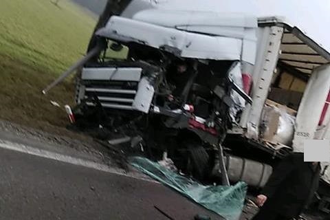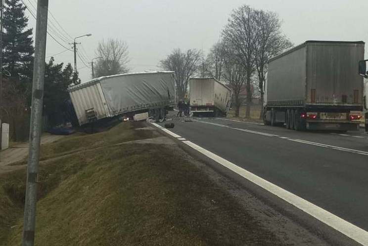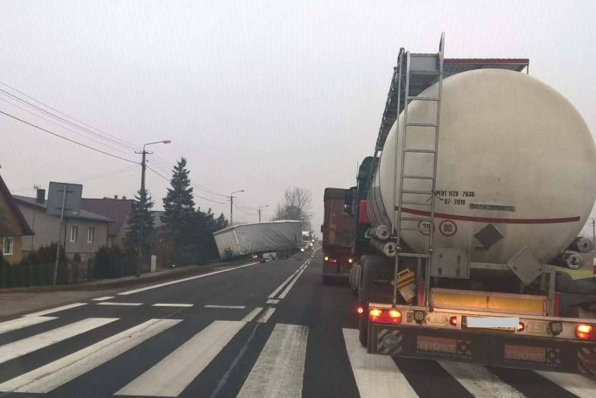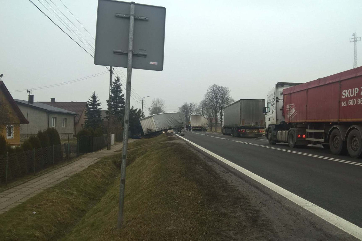 Wstępne ustalenia policjantów wskazują, że w m. świdry Dobrzyce jeden TIR wjechaŁ do rowu, naczepa stanela w poprzek drogi, drugi TIR uderzyl w naczepe. Jedna osoba została ranna.