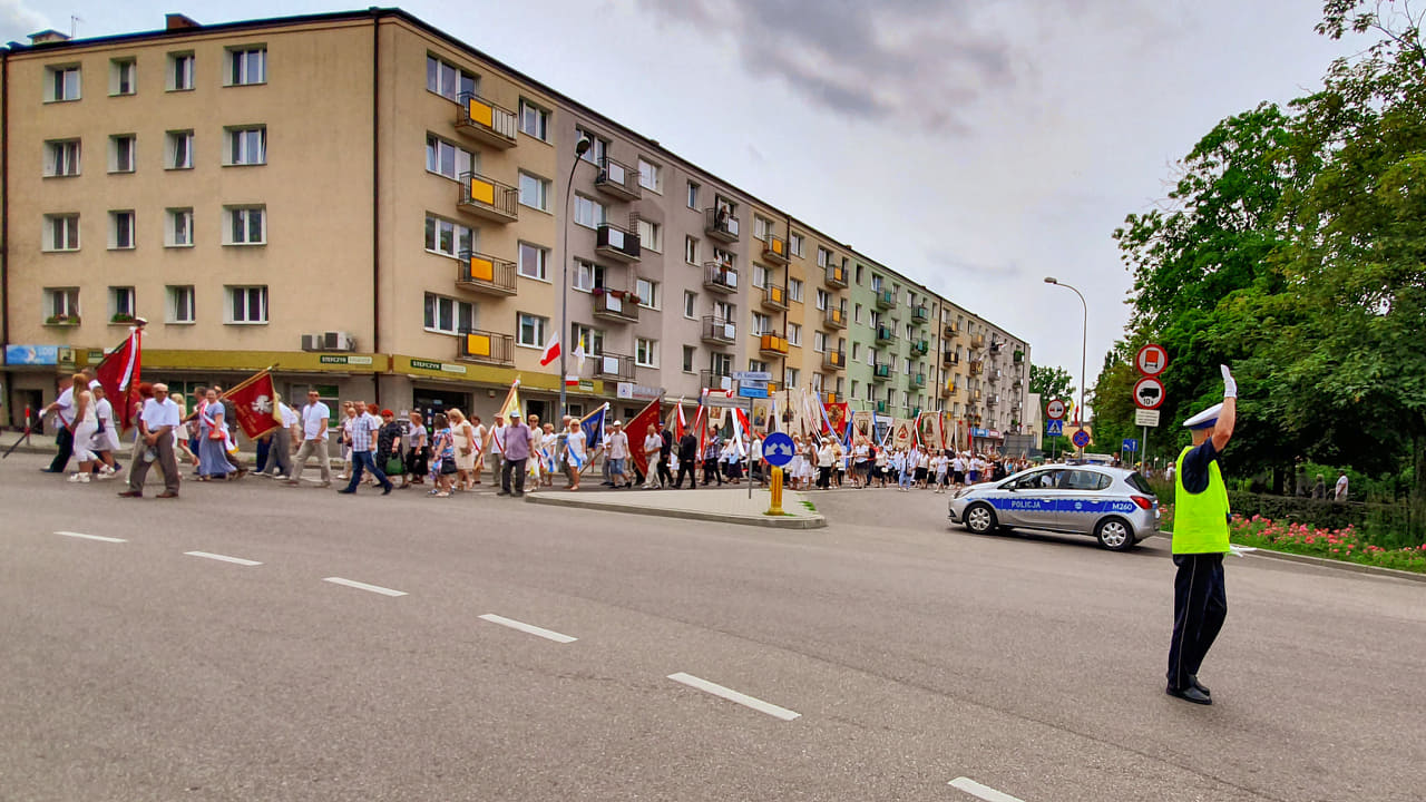 Łomżyńscy policjanci podczas pełnionej służby zabezpieczali wczoraj przemarsze procesji z okazji święta Bożego Ciała. Mundurowi dbali o bezpieczeństwo pieszych mieszkańców miasta oraz pomagali kierowcom sprawnie pokonać występujące czasowo utrudnienia w ruchu.