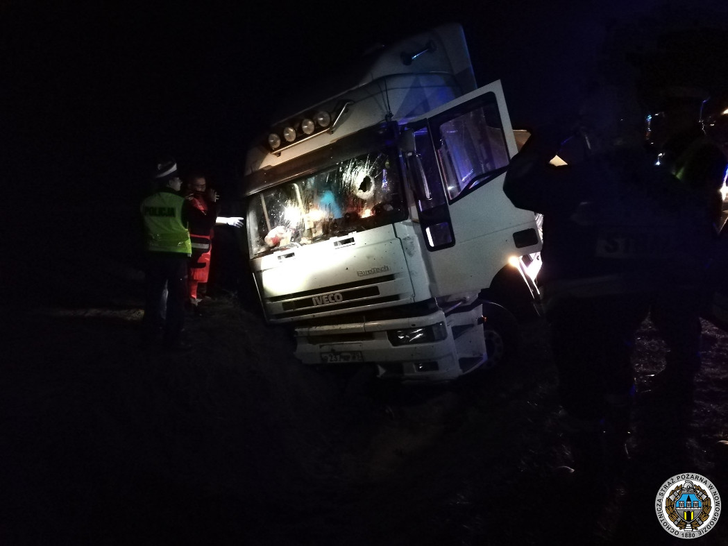 Osobowe Audi uderzyło w rozrzutnik obornika, a oderwana od niego część przebiła szybę przejeżdżającego z przeciwnej strony Tira. Ciężarówka zjechałą do rowu. Jej kierowca zginął na miejscu. Droga jest zablokowana.