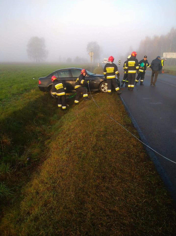 Kierujący BMW jadąc od Ostrołęki w kierunku Czerwina, na łuku drogi stracił panowanie nad autem, zjechał na pobocze a następnie dachował w przydrożnym rowie.