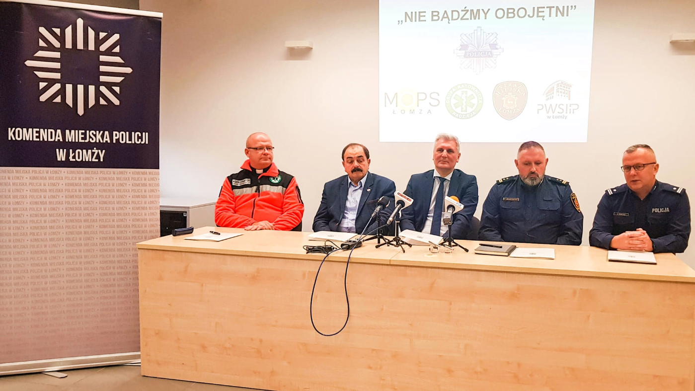 Porozumienie podpisali: I Zastępca Komendanta Miejskiego Policji w Łomży - podinsp. Krzysztof Sewioło, Rektor Państwowej Wyższej Szkoły Informatyki i Przedsiębiorczości w Łomży - dr hab. Dariusz Surowik, Dyrektor Miejskiego Ośrodka Pomocy Społecznej w Łomży - mgr. inż. Wiesław Jagielak, Komendant Straży Miejskiej – Paweł Żebrowski oraz Prezes Stowarzyszenia Pomocy Rodzinom „Nadzieja” w Łomży – ks. Radosław Kubeł. Uczestnicy spotkania określili priorytety i zakres działań na nadchodzący okres zimowy, a także wymienili się spostrzeżeniami i doświadczeniami z ubiegłego roku.