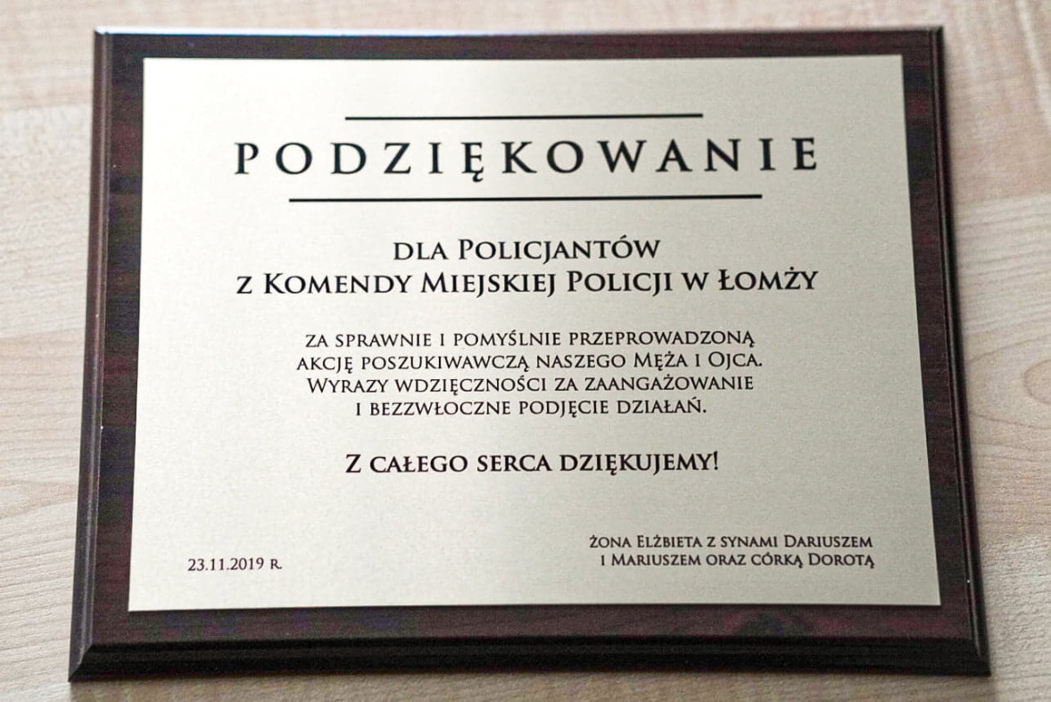 Wczoraj na ręce I Komendanta Miejskiego Policji w Łomży - rodzina zaginionego mężczyzny - złożyła podziękowanie dla policjantów zaangażowanych w sobotnie poszukiwania.