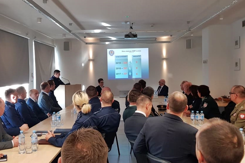 Podczas swojego wystąpienia Komendant Woźniewski podkreślił rolę Krajowej Mapy Zagrożeń Bezpieczeństwa, jako skutecznego narzędzia współpracy Policji ze społeczeństwem. Wskazał, że w 2019 roku mieszkańcy nanieśli na mapę 2864 zgłoszenia, natomiast w wyniku sprawdzenia wskazanych miejsc 77,41 % z nich zostało potwierdzonych. Najczęściej mieszkańcy wskazywali miejsca gdzie spożywany jest alkohol w miejscach niedozwolonych, przekraczana jest prędkość czy samochody parkowane są w niewłaściwy sposób.Komendant wskazał, że badania opinie społecznej prowadzone przez CBOS wskazują, iż że 75 % respondentów dobrze ocenia pracę Policji, a 98 % Polaków czuje się bezpiecznie w miejscu zamieszkania, natomiast 89 % obywateli uważa, że Polska jest bezpieczna. Podsumowując, dodał, że funkcjonariusze z Łomży będą nadal z całym poświęceniem i angażowaniem dbać o bezpieczeństwo mieszkańców powiatu łomzyńskiego. Po za kończeniu prezentacji, głos zabrał Starosta Łomżyński Pan Lech Szabłowski, który podziękował za dotychczasową pracę policjantów i życzył wielu sukcesów w 2020 roku