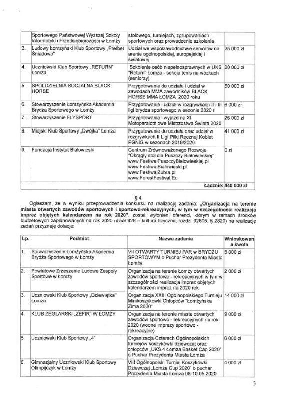 Miasto wsparło również organizację imprez sportowych i sportowo-rekreacyjnych. Na ten cel wygospodarowano w budżecie 100 000 zł. Największą pulę w kwocie 30 000 zł otrzyma Podlaskie Towarzystwo Krzewienia Kultury Fizycznej, które zorganizuje Czwartki Lekkoatletyczne i XX Memoriał W. Czerniawskiej. Oprócz tego 16 000 zł trafiło do Miejskiego Towarzystwa Krzewienia Kultury Fizycznej na realizację imprez sportowo-rekreacyjnych dla mieszkańców i 14 000 zł do UKS "Dziewiątka" na zorganizowanie XXIII Ogólnopolskiego Turnieju Minikoszykówki Chłopców "Łomżyńska Zima 2020". Jak co roku, dotację otrzymał Miejski Szkolny Związek Sportowy w Łomży. Kwota 50 000 zł będzie przeznaczona na "Realizację systemu współzawodnictwa sportowego dzieci i młodzieży szkolnej".