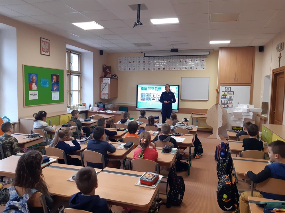 Policjanci spotykają się z uczniami szkół podstawowych, aby rozmawiać o tym jak unikać zagrożeń w drodze do szkoły oraz jak budować właściwe relacje z rówieśnikami. Takie spotkania z policjantem to dobry sposób na skuteczną naukę o bezpieczeństwie.