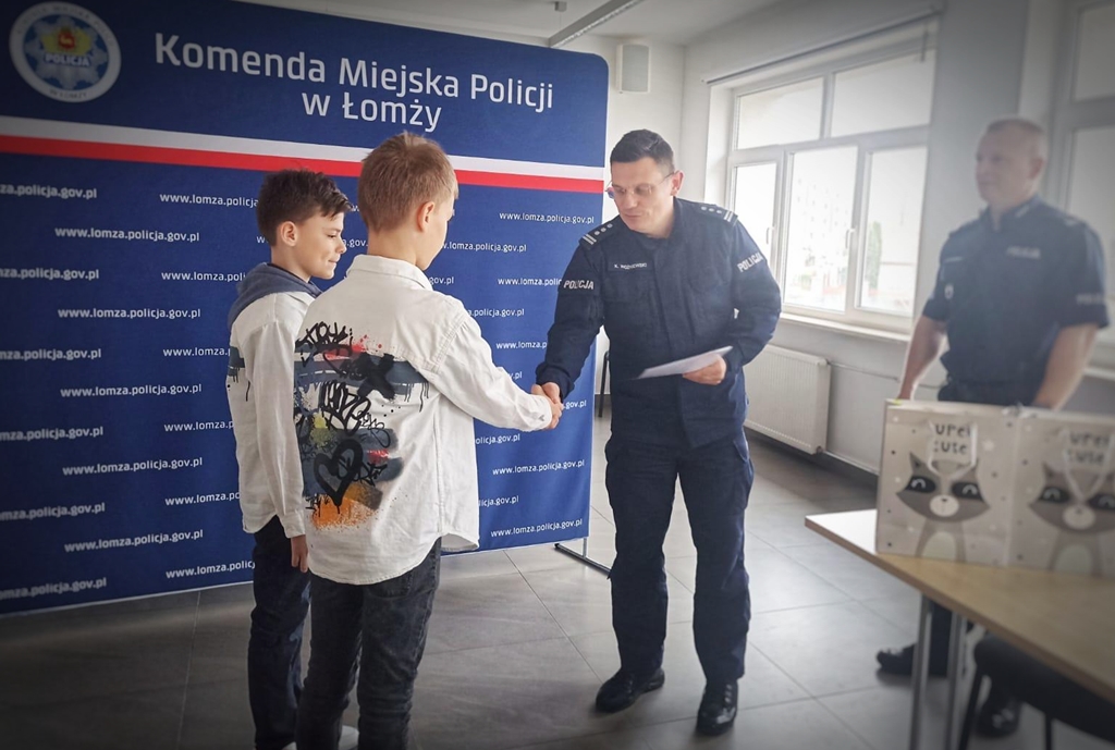 Komendant Miejski Policji w Łomży inspektor Krzysztof Woźniewski wraz ze swoim Zastępcą młodszym inspektorem Marcinem Rymarskim podziękowali i złożyli gratulacje za wzorową postawę dwóm chłopcom. Bracia, po tym jak znaleźli sporo pieniędzy, wykazując się ogromną uczciwością, przekazali je policjantom, aby te na komendzie mogły bezpiecznie czekać na właściciela.