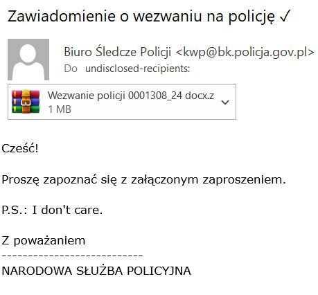 Od wczoraj są rozsyłane fałszywe wiadomości e-mail, w których oszuści podszywają się pod Komendę Wojewódzką Policji w Białymstoku. Sprawcy preparują wiadomości e-mail w taki sposób, że nadawcą jest „Biuro Śledcze Policji”, podszywając się pod autentyczny adres e-mail KWP w Białymstoku tj. kwp@bk.policja.gov.pl. Wiadomość zatytułowana „Zawiadomienie o wezwaniu na policję” posiada załącznik „Wezwanie policji 0001308_24.docx.z”. Przedmiotowy załącznik zawiera złośliwe oprogramowanie, które ma za zadanie wykradać dane użytkowników zainfekowanego urządzenia.