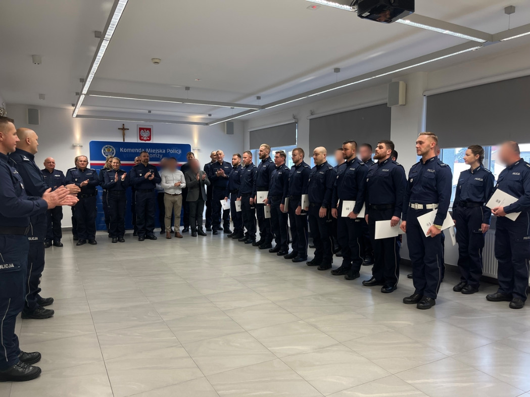Dziś odbyło się spotkanie Komendanta Miejskiego Policji w Łomży inspektora Adama Antoniego Chodziutko oraz jego zastępcy młodszego inspektora Piotra Kleja z funkcjonariuszami naszej jednostki. Komendanci wręczyli mundurowym akty mianowania na wyższe stopnie policyjne oraz świadectwa ukończenia szkolenia zawodowego podoficerskiego i aspiranckiego. W uroczystości wzięła udział również kadra kierownicza łomżyńskiej jednostki. Od swojego przełożonego policjanci odebrali gratulacje i życzenia dalszych sukcesów zawodowych.