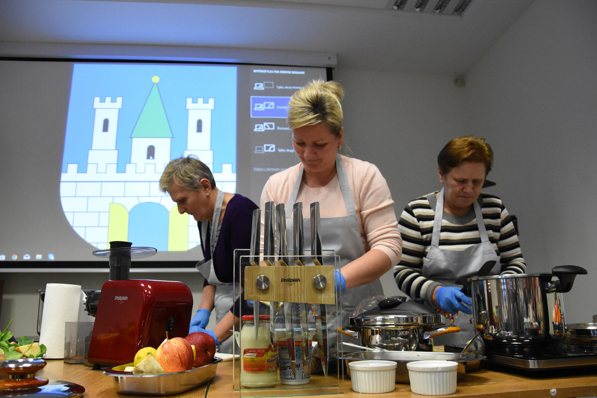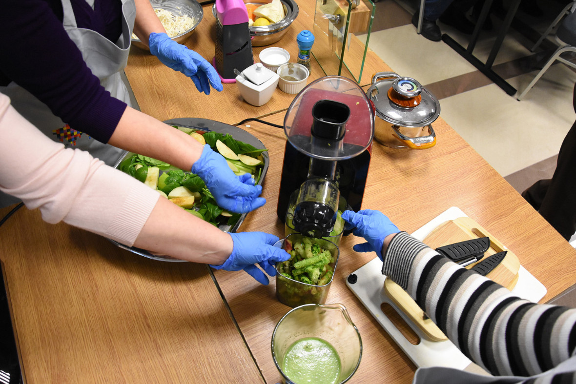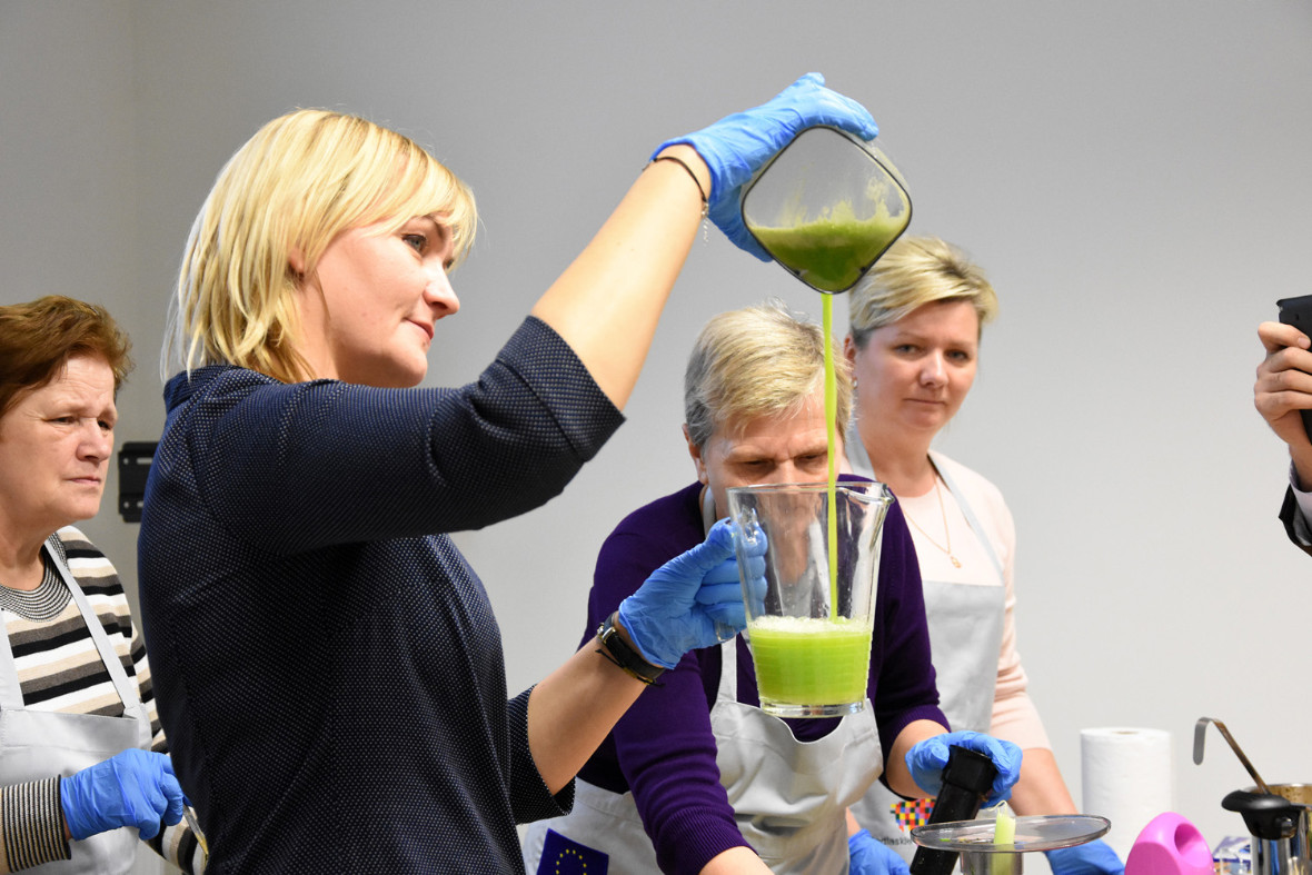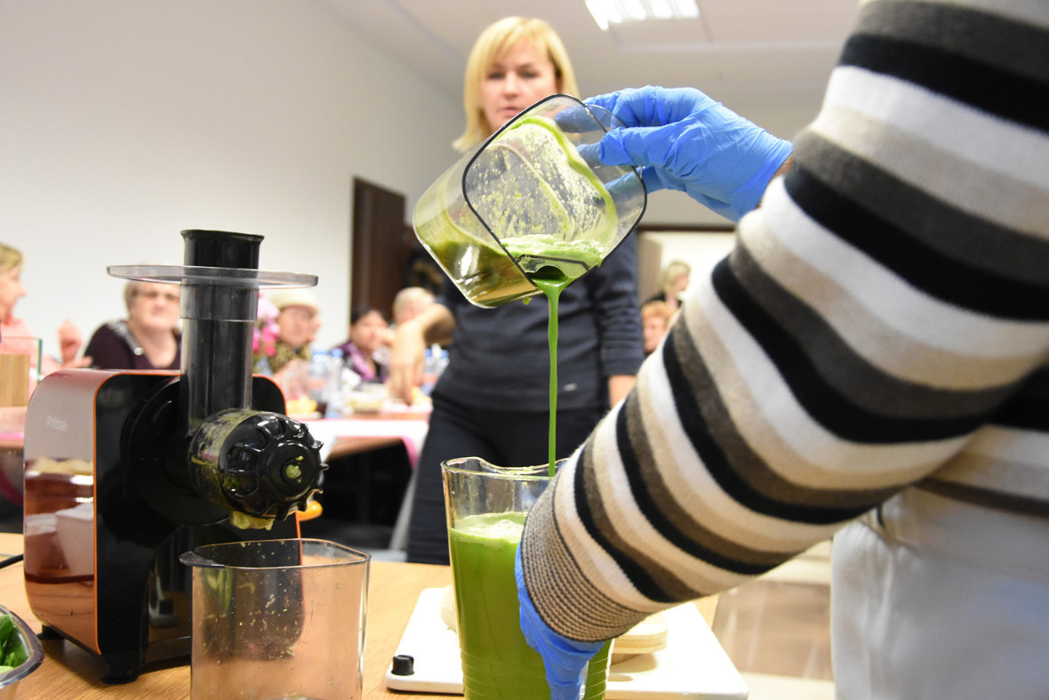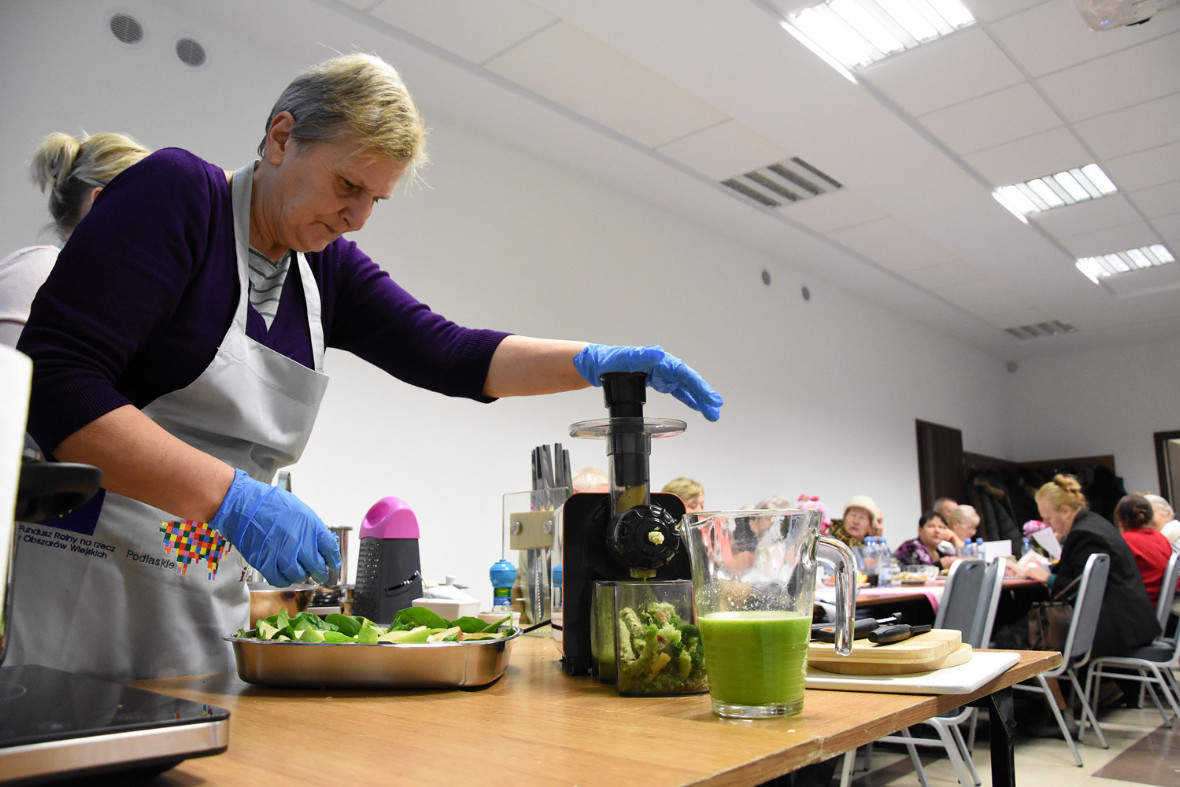 Drugą część, praktyczną poprowadziła Anna Panasewicz, mistrz kulinarny. Wraz z uczestniczkami spotkania pokazała jak wykonać proste i szybkie posiłki dla diabetyków: kaszotto, krem z dyni, zestaw surówek i wyciskane soki z warzyw i owoców. W warsztatach uczestniczył Stefan Krajewski, członek zarządu województwa podlaskiego, który osobiście serwował krem z dyni.