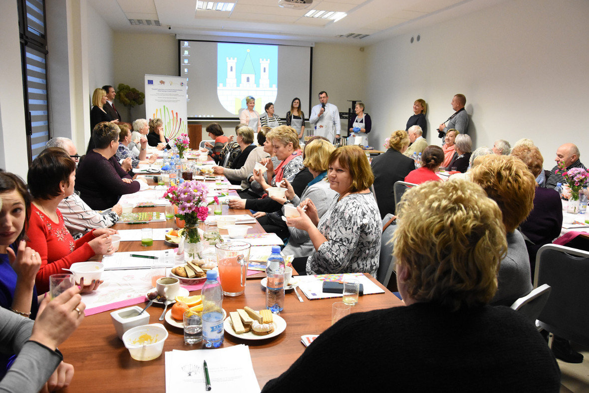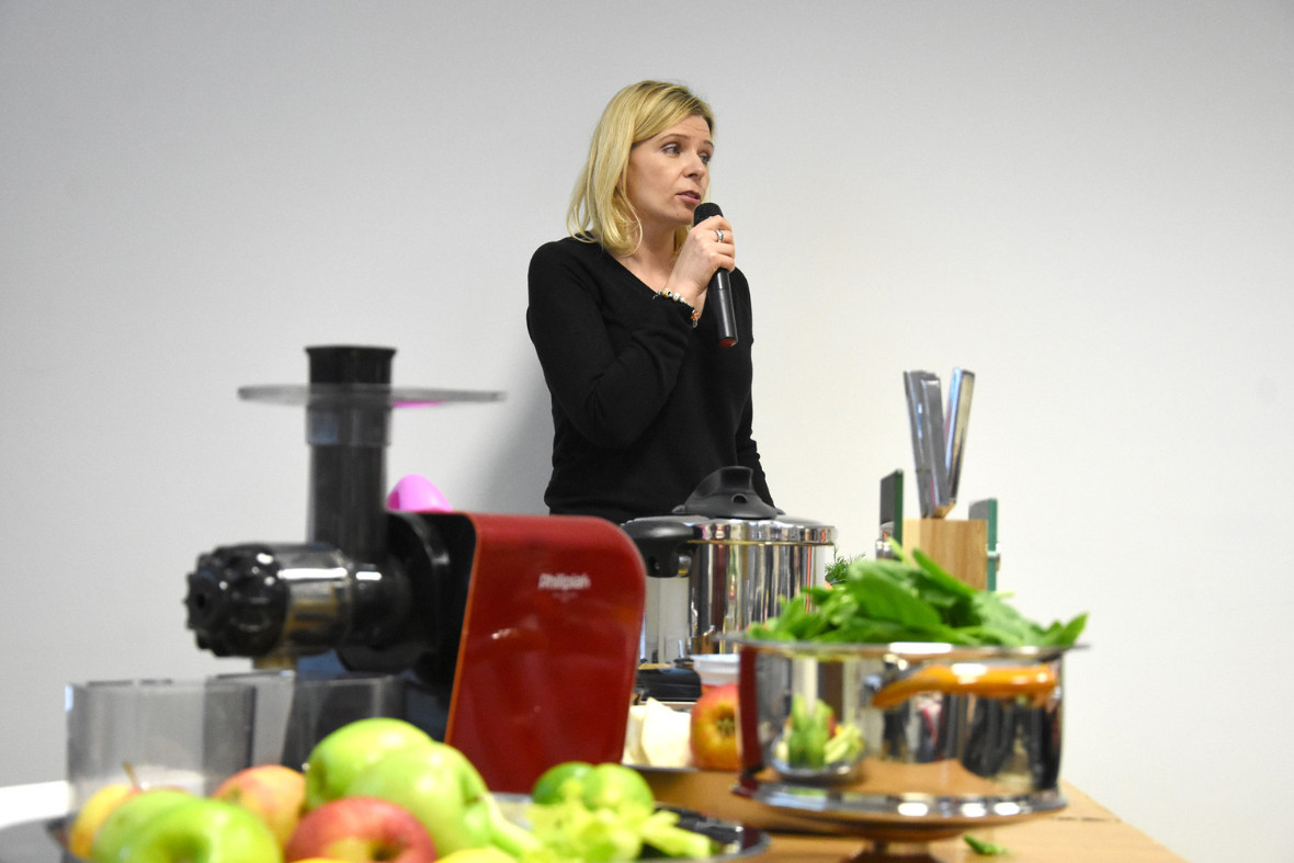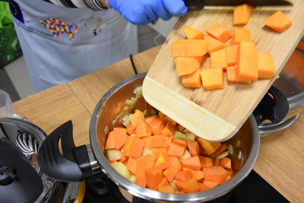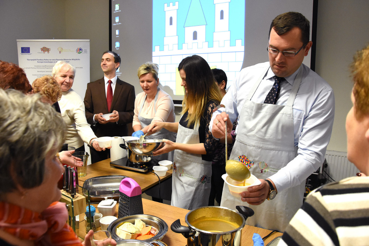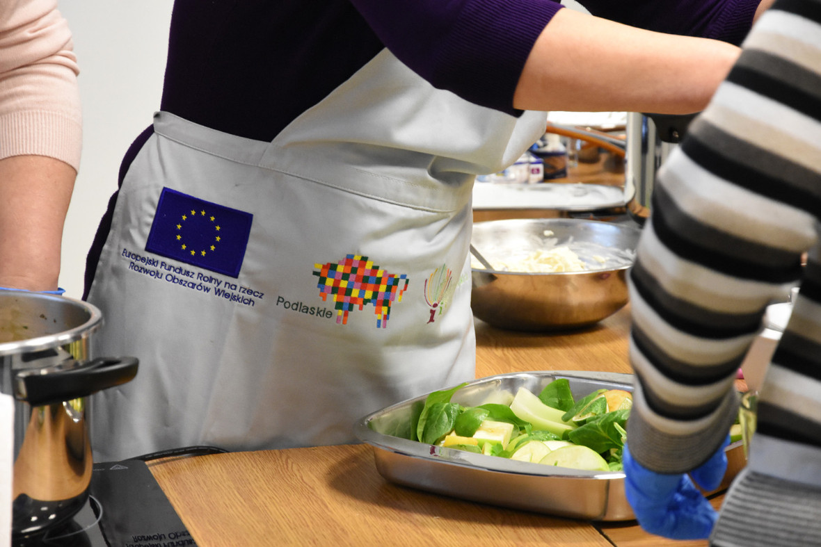 Drugą część, praktyczną poprowadziła Anna Panasewicz, mistrz kulinarny. Wraz z uczestniczkami spotkania pokazała jak wykonać proste i szybkie posiłki dla diabetyków: kaszotto, krem z dyni, zestaw surówek i wyciskane soki z warzyw i owoców. W warsztatach uczestniczył Stefan Krajewski, członek zarządu województwa podlaskiego, który osobiście serwował krem z dyni.