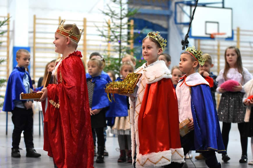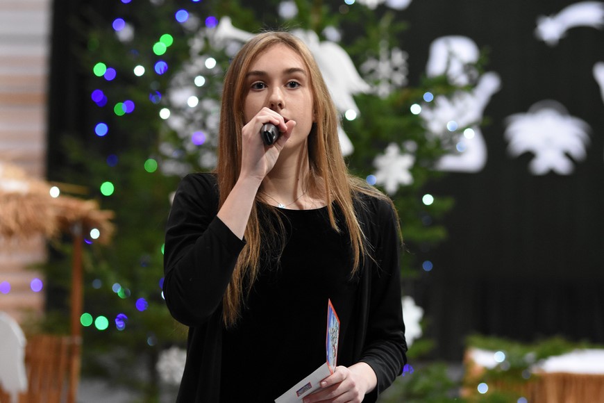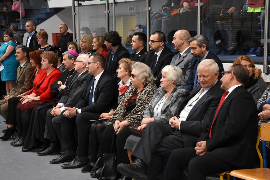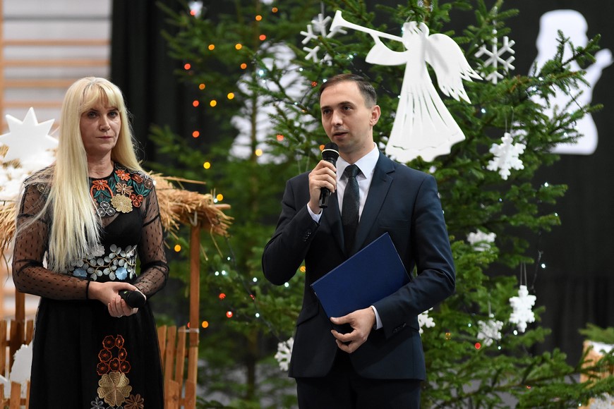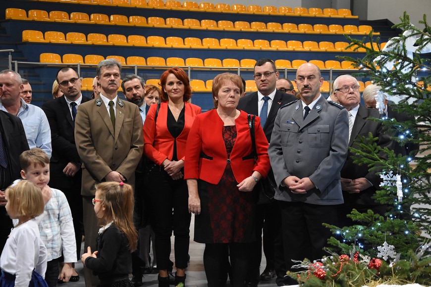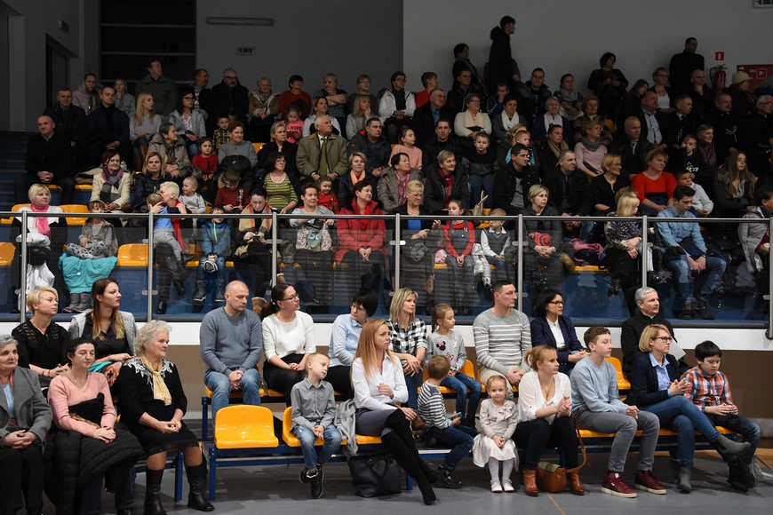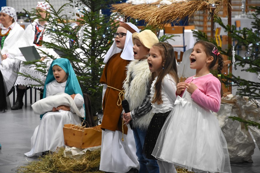 Następnie wszyscy zgromadzili się na hali widowiskowo-sportowej przy Zespole Szkół Samorządowych. Przybyłych mieszkańców gminy oraz gości przywitał Grzegorz Palka, burmistrz Nowogrodu oraz Maria Dąbrowska prezes TPZŁ oddział w Nowogrodzie. Na początku przed publicznością wystąpiła Iza Cwalina oraz przedszkolaki z jasełkami. Z ogromnym przejęciem dzieci śpiewały kolędy i prezentowały sceny z narodzenia Jezusa. Wypełniona po brzegi widownia z aplauzem przyjmowała występy młodych aktorów. Na zakończenie jasełek Mikołaj wraz z burmistrzem wręczyli dzieciom słodkie prezenty. Kolejnym punktem spotkania bożonarodzeniowego były kolędy w wykonaniu absolwentek szkoły Oli Ziarno, Łucji Borawskiej i Julii Kowalczyk. Swój występ miał także Zespół Śpiewaczy Kobiet działający przy Miejsko-Gminnym Ośrodku Kultury w Nowogrodzie.