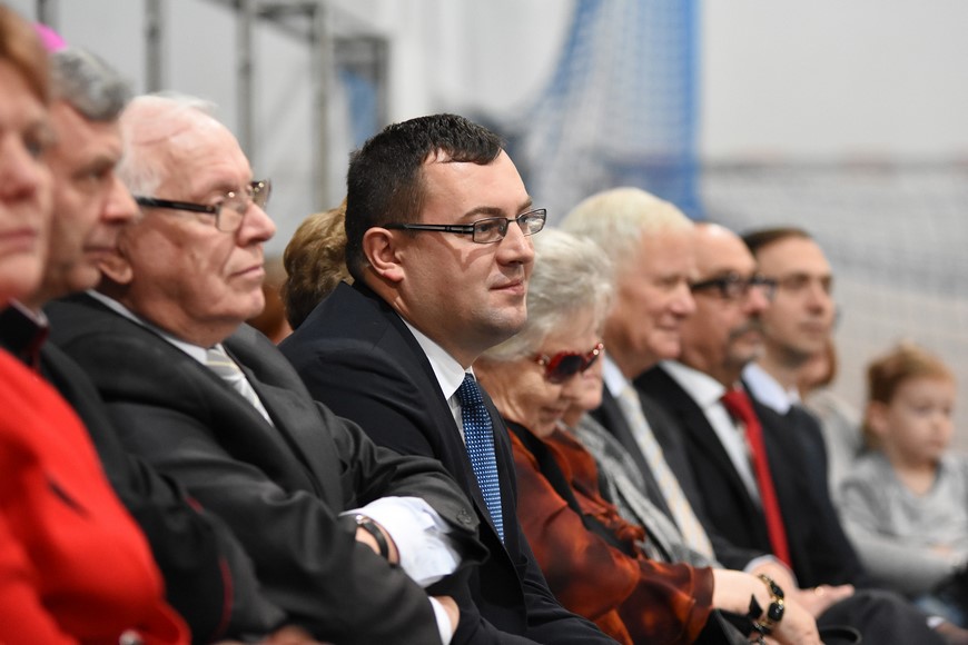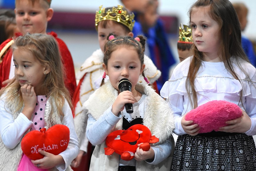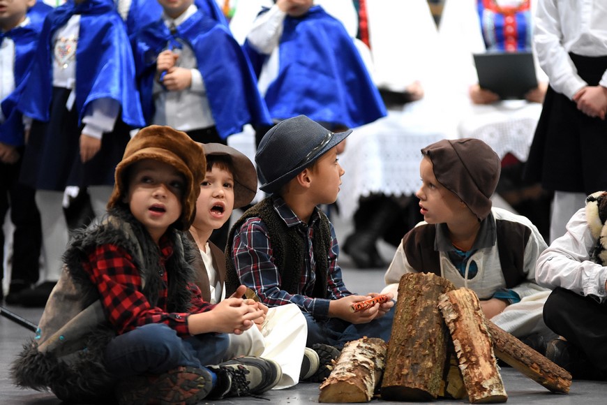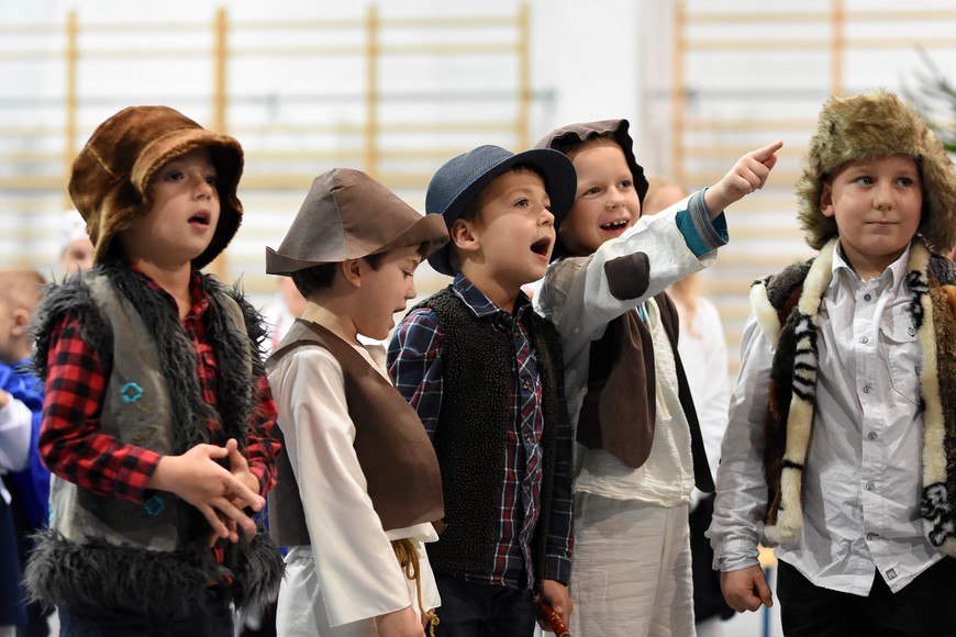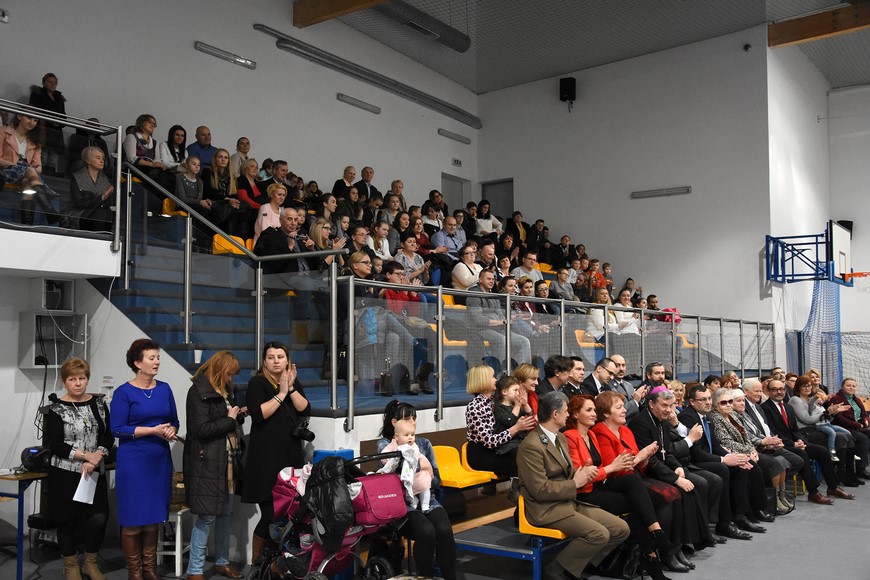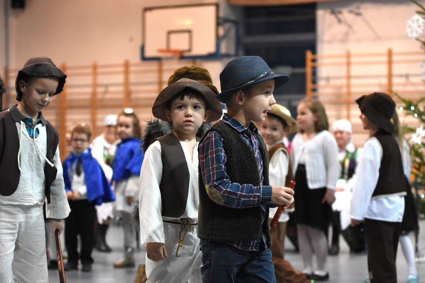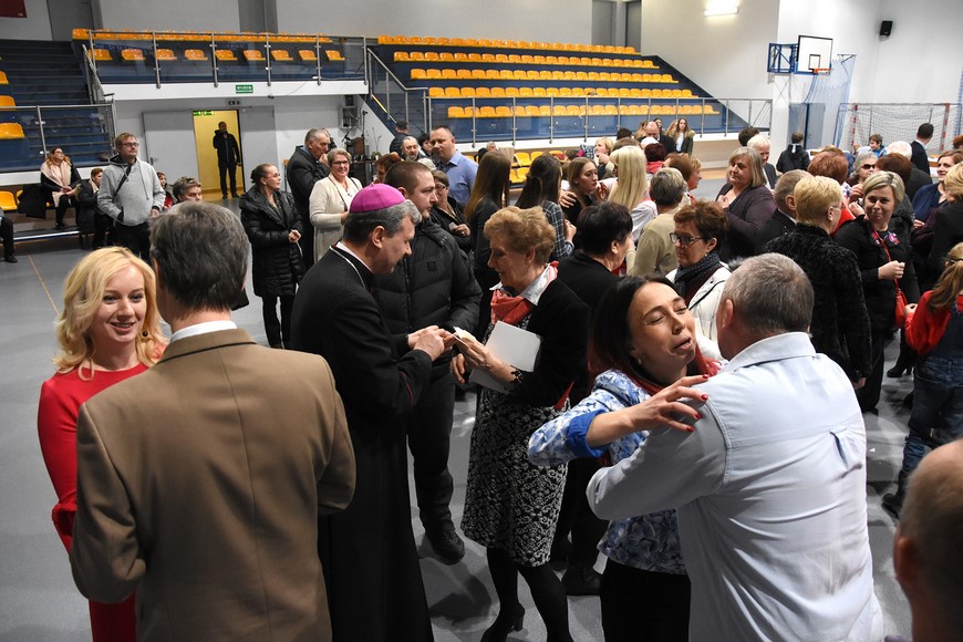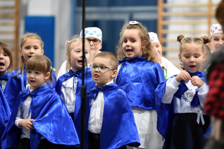 Następnie wszyscy zgromadzili się na hali widowiskowo-sportowej przy Zespole Szkół Samorządowych. Przybyłych mieszkańców gminy oraz gości przywitał Grzegorz Palka, burmistrz Nowogrodu oraz Maria Dąbrowska prezes TPZŁ oddział w Nowogrodzie. Na początku przed publicznością wystąpiła Iza Cwalina oraz przedszkolaki z jasełkami. Z ogromnym przejęciem dzieci śpiewały kolędy i prezentowały sceny z narodzenia Jezusa. Wypełniona po brzegi widownia z aplauzem przyjmowała występy młodych aktorów. Na zakończenie jasełek Mikołaj wraz z burmistrzem wręczyli dzieciom słodkie prezenty. Kolejnym punktem spotkania bożonarodzeniowego były kolędy w wykonaniu absolwentek szkoły Oli Ziarno, Łucji Borawskiej i Julii Kowalczyk. Swój występ miał także Zespół Śpiewaczy Kobiet działający przy Miejsko-Gminnym Ośrodku Kultury w Nowogrodzie.