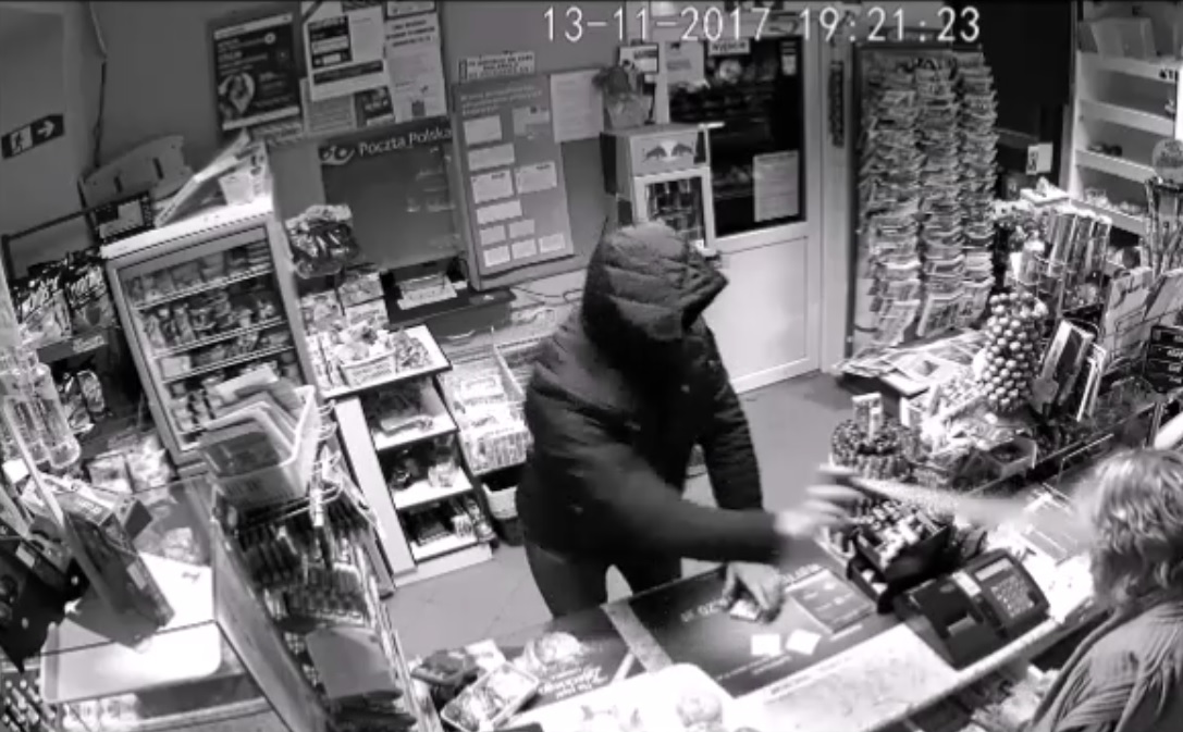 Prosimy o kontakt wszystkie osoby, które rozpoznają na opublikowanym materiale filmowym mężczyznę, podejrzewanego o rozbój w sklepie w Barszczewie. Do zdarzenia doszło 13 listopada 2017 roku. Wtedy to napastnik za pomoca gazu pieprzowego obezwładnił sprzedawczynię, po czym zabrał pieniądze i uciekł.