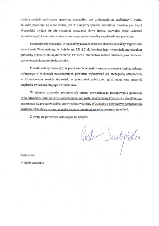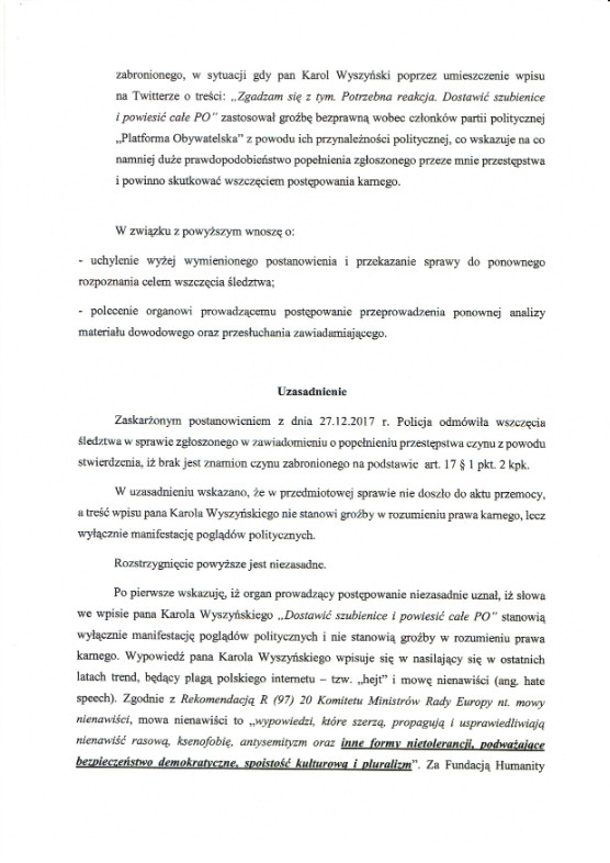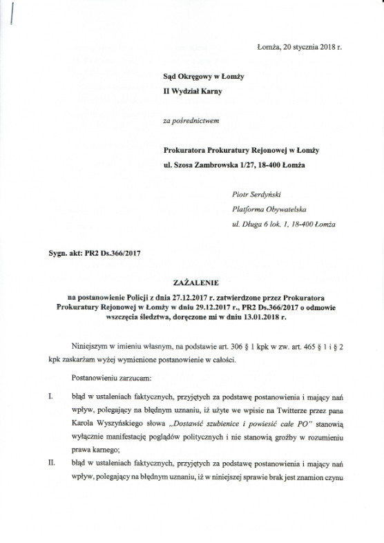 Ostatecznie prokuratura odmówiła wszczęcia śledztwa uzasadniając, iż ww. wpis był normalną manifestacją polityczną. Z takim stanowiskiem prokuratury nie zgadzają się przedstawiciele PO, którzy złożyli dziś do Sądu Okręgowego w Łomży zażalenie w tej sprawie.