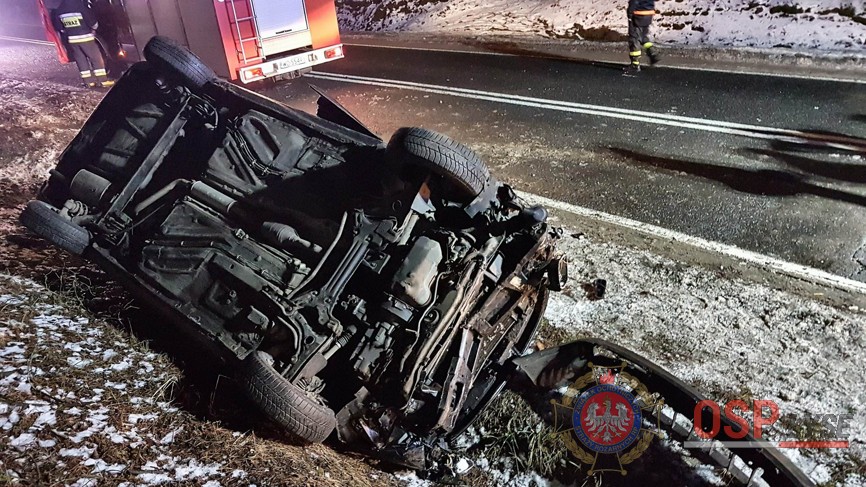 Mundurowi na miejscu zastali auto osobowe leżące na dachu. Osoby podróżujące nim znajdowały się już poza pojazdem.