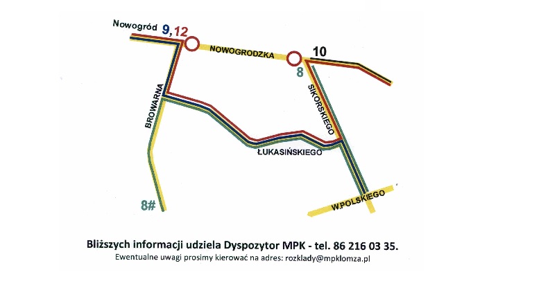 - Linia nr 8# (dojazd do ul. Browarnej) - objazd przez ul. Łukasińskiego z pominięciem przystanków Sikorskiego / NOWOGRODZKA i Sikorskiego / LEŚNA