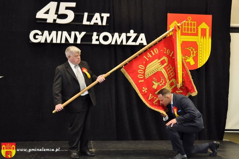 Poświęcenie i przekazanie nowego sztandaru było punktem kulminacyjnym obchodzonego w tym roku jubileuszu 45-lecia gminy Łomża, który odbył się 22 kwietnia 2018 r. w Nowych Kupiskach. W Kościele pw. św. Jadwigi Śląskiej miała miejsce Msza Święta, w trakcie której biskup Tadeusz Bronakowski poświęcił sztandar, a w sali gimnastycznej szkoły nastąpiło jego formalne przekazanie na ręce wójta przez Przewodniczącego Rady Gminy. Jubileusz był także okazją do uhonorowania wieloletnich pracowników urzędu i osób szczególnie zasłużonych w dziedzinach: kultura i rolnictwo.