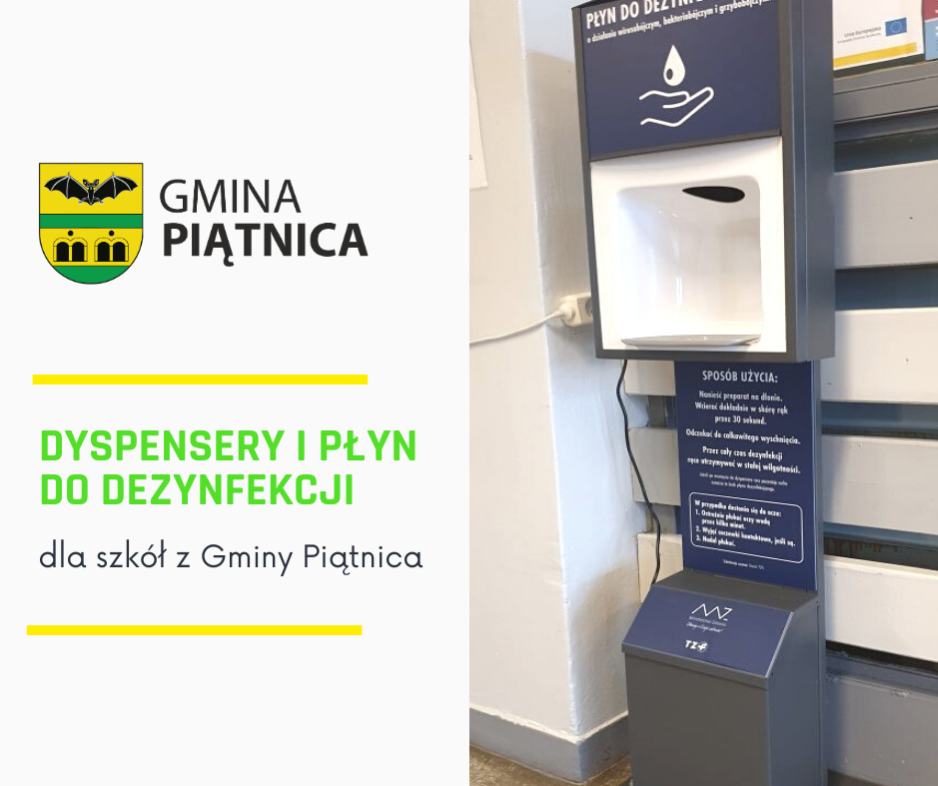 Szkoły mogły wnioskować do Ministerstwa Zdrowia o otrzymanie nieodpłatnie automatycznego dyspensera i płynów do dezynfekcji. Już pięć spośród siedmiu szkół (SP w Dobrzyjałowie SP w Drozdowie, SP w Kisielnicy, SP w Olszynach, SP Rakowo-Boginie oraz Zespół Szkolno-Przedszkolny w Piątnicy) dostały nieodpłatnie na okres 18 miesięcy dyspensery. Szkoła Podstawowa w Dobrzyjałowie i Szkoła Podstawowa w Jeziorku czekają na montaż. Po upływie czasu bezpłatnego używania placówki mają możliwość podjęcia decyzji o dalszej współpracy z zakresie użytkowania sprzętu. Użyczającym dyspensery jest Polfa Tarchomin SA.