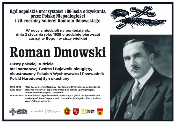 Prezydent Łomży oraz Zarząd Główny Związku Żołnierzy Narodowych Sił Zbrojnych zapraszają na ogólnopolskie uroczystości 100-lecia odzyskania przez Polskę Niepodległości i 79. rocznicy śmierci Romana Dmowskiego, które odbędą się 2 stycznia 2018 roku w Drozdowie i Łomży. Uroczystości organizowane są w ramach „Roku Jubileuszu 100-lecia odzyskania przez Polskę Niepodległości”, którym zgodnie z uchwałą Sejmu Rzeczypospolitej Polskiej został ustanowiony rok 2018.