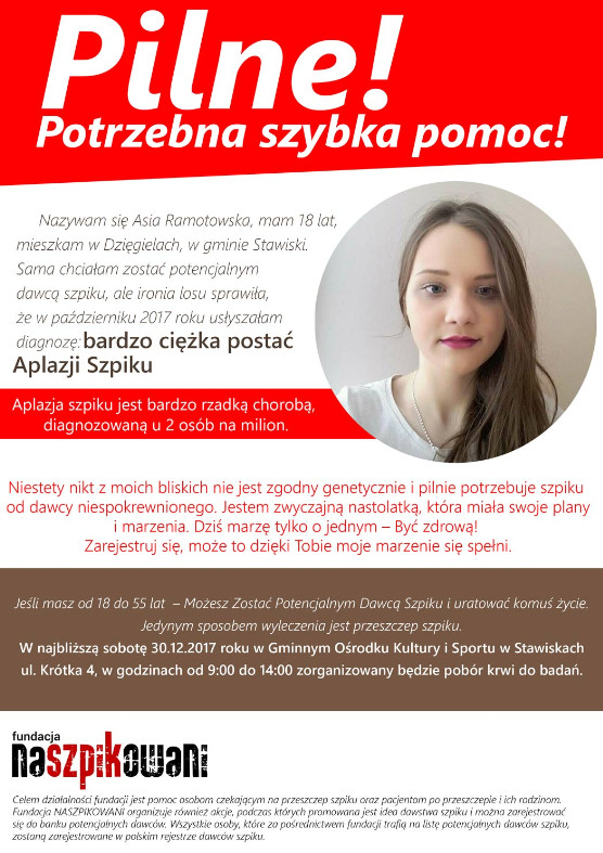 organizowany jest pobór krwi do badań na zgodność. Okazało się, że nikt z rodziny nastolatki nie jest zgodny genetycznie. O pomoc dla Asi apelują między innymi władze I Liceum Ogólnokształcącego w Łomży.