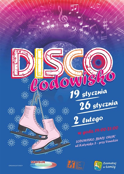 Dyskoteki na łyżwach odbywać się będą w godzinach 19.00-21.00 w piątki: 19 stycznia, 26 stycznia oraz 2 lutego. O profesjonalne nagłośnienie zadba Miejski Dom Kultury - Dom Środowisk Twórczych. Uczestnictwo w DISCO Lodowisko nie wymaga dodatkowych opłat. Wystarczy nabyć standardowy bilet wejścia na Lodowisko.