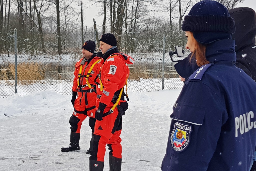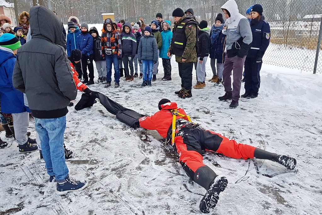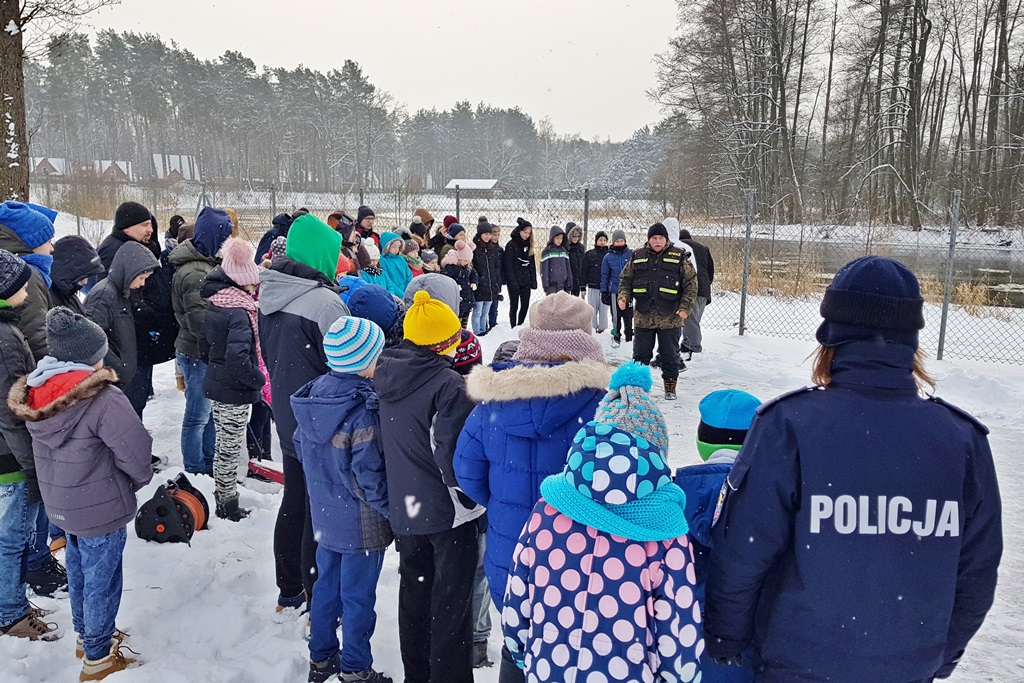 Łomżyńscy policjanci prowadzą działania profilaktyczne pn. „Bezpieczne ferie 2018”. Funkcjonariusze wspólnie ze strażakami odwiedzili dzieci wypoczywające w ośrodku „Caritas Bliźnim” w Ptakach, gdzie mówili o bezpiecznej zimowej zabawie oraz zorganizowali niecodzienny pokaz ratowania życia ludzkiego w przypadku sytuacji załamania lodu na zbiorniku wodnym.