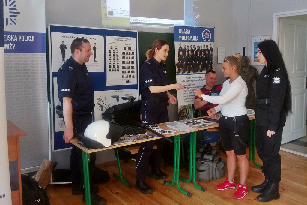 Wczoraj w ramach Dnia Otwartego w Zespole Szkół Technicznych i Ogólnokształcących nr 4 w Łomży, policjanci zachęcali młodzież do wstąpienia w swoje szeregi. Policyjne stoisko miało na celu przybliżenie codziennej pracy łomżyńskich funkcjonariuszy. Odwiedzający mogli obejrzeć pokaz posłuszeństwa psa służbowego oraz porozmawiać z technikiem kryminalistyki. Chętni próbowali także swoich sił w daktyloskopii. Osobom zainteresowanym wręczane były ulotki informacyjne o naborze do służby.