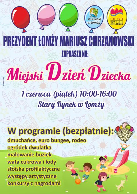 Prezydent Łomży zaprasza najmłodszych mieszkańców Łomży wraz z opiekunami na Miejski Dzień Dziecka, który odbędzie się w piątek 1 czerwca w godzinach 10:00–16:00 na Starym Rynku. W programie przewidziano m.in.: dmuchańce, rodeo, malowanie buziek, ogródek dwulatka, watę cukrową i lody, wszystko oczywiście bezpłatnie. Nie zabraknie także występów artystycznych i konkursów z nagrodami.